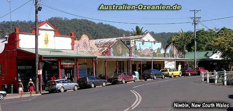 Auf einen Besuch dieser "Stadt" sollte man sich als arbeitender und steuerzahlender Normalbürger mit sechs Wochen Jahresurlaub mental vorbereiten. Am Ortseingang befand sich früher ein Schild mit dem von Hanfblättern umgebenen Schriftzug: "Nimbin - Alcohol free Zone" (war in 2004 jedoch abmontiert). Eine Kommune kiffender Alt- und Junghippies auf der endlosen Suche nach sich selbst! Man glaubt es nicht! Keine Bauwagensiedlung, sondern eine ganze (Klein-) Stadt! Auf einem kurzer Bummel entlang der Straße erhält man höchst interessante Eindrücke - kein Hollywoodfilm kann hier mithalten! - Auch in der näheren Umgebung von Nimbin wohnen viele "alternative people", deren Lebensstil durch das milde Klima begünstigt wird.