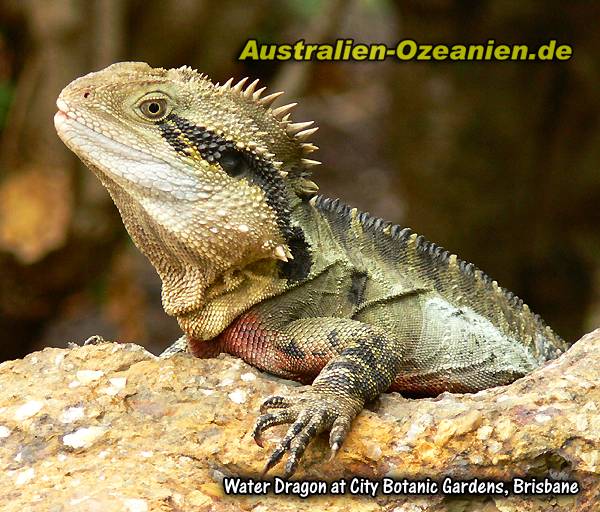 | Wasseragamen (engl. water dragon) in den Botanic Gardens von Brisbane. Im Bild links der Größenvergleich mit einer Ente... Das Foto rechts gibt es auch als wallpaper in höherer Auflösung: http://www.australien-ozeanien.de/desktop-background/Australia/Wasseragame.html |