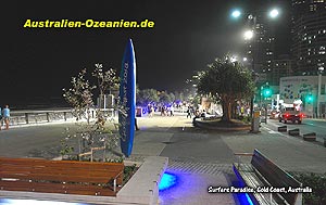 Die Stadt ist eine von weinigen in Australien, die über ein Nachtleben verfügt und in der auch noch nach Einbruch der Dunkelheit Betrieb auf den Strassen ist. Selbstverständlich kann man auch an diesem Ort sein Geld für alle nur erdenklichen Vergnügungen wie Doppeldecker-Fliegen, Reverse-Bungee, Jet Boating, etc. durchbringen. Wer mobil ist sucht sich geschickter Weise eine Unterkunft außerhalb der Stadt. Die meisten Motels liegen unmittelbar am Gold Coast Highway. Dort ist es zwar auch nicht unbedingt ruhig, dafür bieten die einem Miniappartement gleichen Motelzimmer aber mehr Platz zu e In Surfers Paradise kann der Urlauber jedes erdenkliche Australien-Andenken erwerben. Viele Geschäfte sind regelrechte Souvenir-Discounter. Das große Einkaufszentrum "Pacific Fair" etwas außerhalb der Stadt wird im Augenblick erweitert und soll nach Fertigstellung das größte Queenslands und das viertgrößte Australiens sein. Theme Parks wie Movie World, Sea World, Wet 'n' Wild im Norden machen die Gold Coast zu Australiens Vergnügungshauptstadt. Als Nicht-Surfer wird Sie mehr noch als der Strand das hinterland der Gold Coast begeistern (es wird hier tatsächlich so genannt!): Dschungel, Nationalparks, Wasserfälle, einmalige Wanderwege im Springbrook und Lamington Nationalpark. Eine weitere Attraktion ist Population: Im Großraum Gold Coast leben gut eine halbe Million Menschen, und nur rund 20.000 davon in Surfers. Klima und Reisezeit: Der Pazifik erreicht im subtropischen Klima nur in den Sommermonaten Dezember bis Februar angenehme Badetemperaturen von 25 Grad. Im Winter sinkt die Wassertemperatur auf knapp unter 15 Grad. Anreise Die Gold Coast hat einen eigenen Flughafen: Coolangatta (OOL) wird z. B. von Sydney direkt angeflogen. Die Fahrzeit mit dem PKW vom Flughafen Brisbane (BNE) betrtägt eine, von Sydney etwa 12 Stunden.