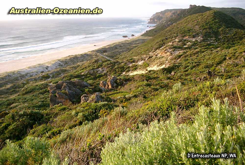 Von Northcliffe, einem Ort, wo es nach 18.00 Uhr noch nicht einmal mehr Benzin gibt, fährt man Richtung Küste durch eine Art feuchter Dünenlandschaft mit interessanter Vegetation. Nach etwa einer halben Stunde erreicht man die Scenic Cliffs mit eindrucksvollem Blick auf die klüftige Kalksteinküste. Ein schöner Wanderweg führt oben entlang der Klippen oder hinunter zum Meer. Sehr empfehlenswert! |